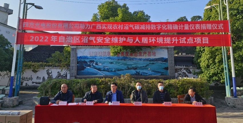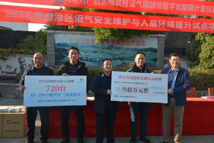 为持续提升农村人居环境,加快生态宜居美丽乡村建设,12月15日,广西农村能源技术推广站在阳朔县福利镇枫林村举行2022年广西沼气安全维护与人居环境整治提升试点项目沼气流量计捐赠仪式。四方光电股份有限公司、桂林市农业农村局、阳朔县县委等有关部门领导参加捐赠仪式。