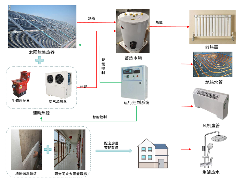 模式简介:太阳能+辅助热源户用取暖是将太阳能转换成热能,配合生物质炉具或空气源热泵等作为辅助热源满足建筑供暖需求。白天主要利用太阳能采暖,包括被动式和主动式两种形式,被动式也称被动式太阳房,主要是利用建筑物朝向和结构,通过增加南窗比例、设置集热蓄热墙、附加阳光间等方式吸收太阳热辐射采暖;主动式主要是利用太阳能集热器,配套蓄热水箱、循环水泵等进行采暖。夜间或阴雨天依靠辅助热源保障持续供暖。